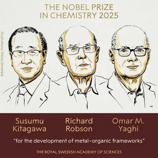 2025 年10月8日,瑞典皇家科学院宣布将本年度诺贝尔化学奖授予在金属有机框架材料(Metal-Organic Frameworks, MOFs)领域作出开创性贡献的三位科学家——日本京都大学的北川进(Susumu Kitagawa)、澳大利亚墨尔本大学的理查德・罗布森(Richard Robson)以及美国加州大学伯克利分校的奥马尔・M・亚吉(Omar M. Yaghi)。