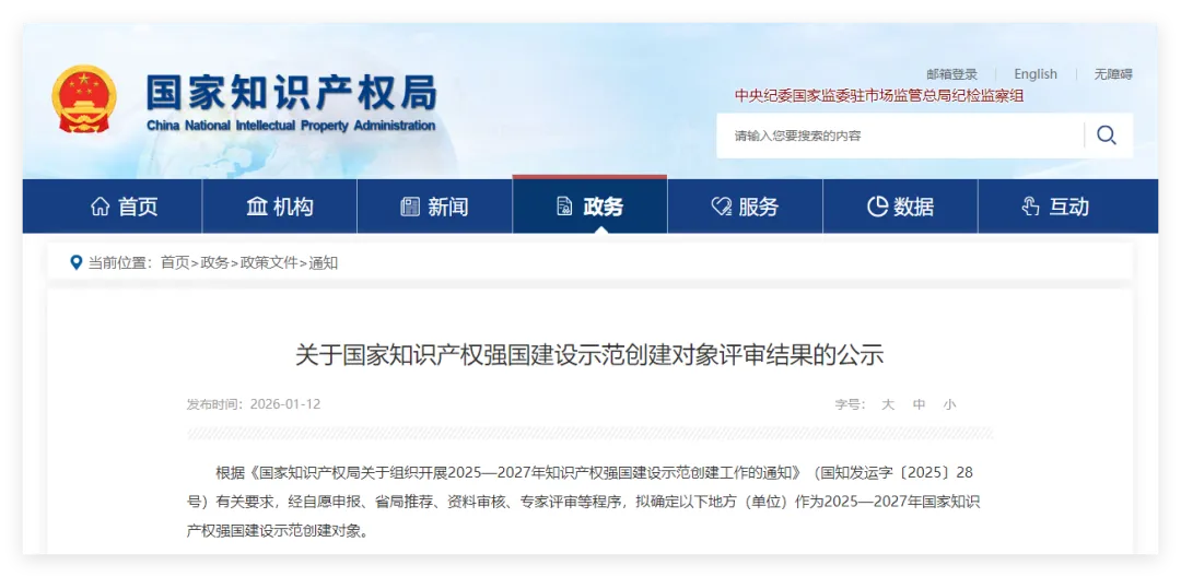1月12日,国家知识产权局公示2025—2027年知识产权强国建设示范创建对象名单,山东圣泉新材料股份有限公司入选。