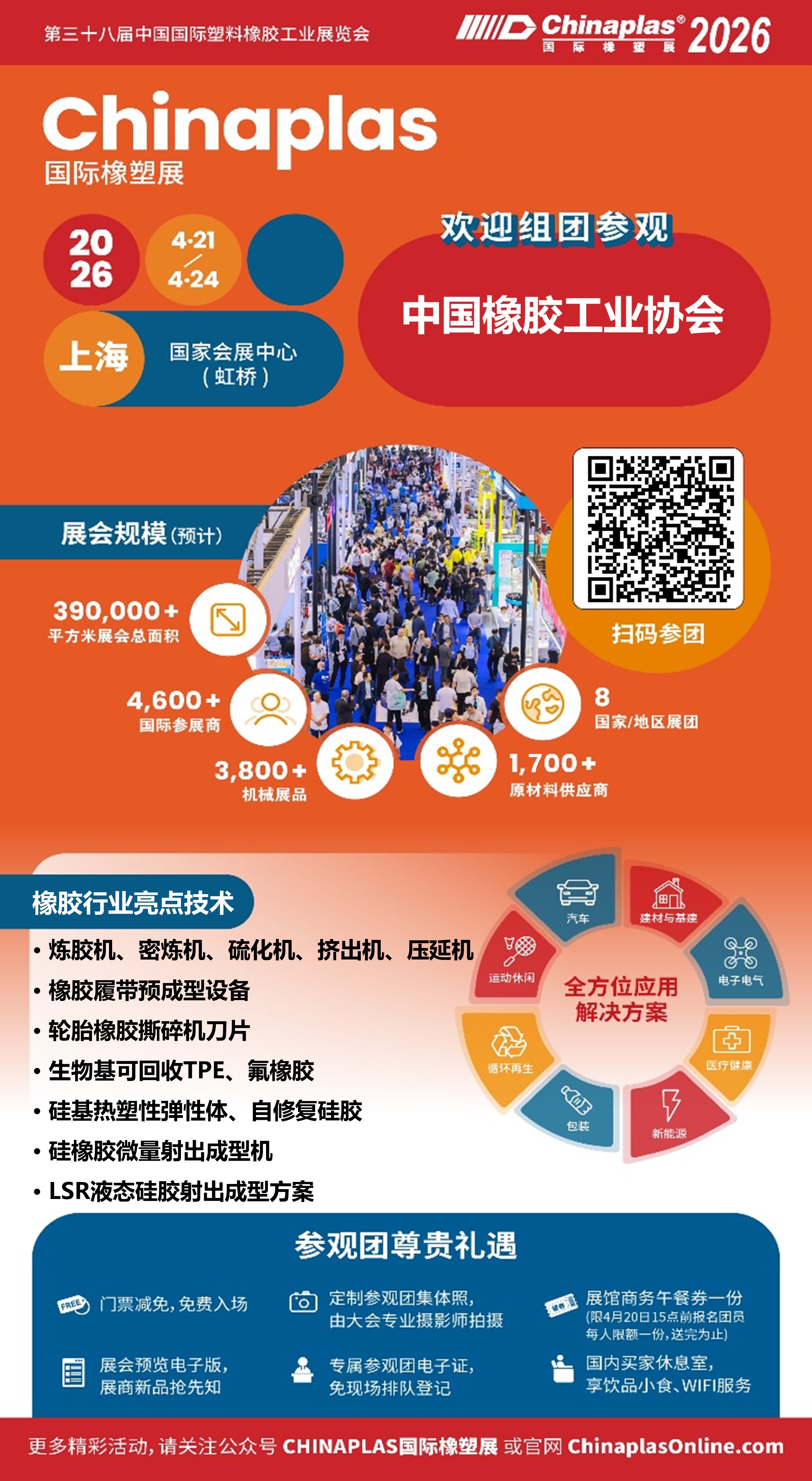CHINAPLAS 2026 国际橡塑展将于2026年4月21日-4月24日在上海 · 国家会展中心(虹桥)盛大召开。欢迎意向参观的企业于2026年4月20日前积极扫码报名,具体事项详情如下: