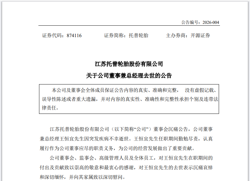 2月25日,江苏托普轮胎股份有限公司(证券代码:874116)发布公告,公司董事兼总经理王恒宜先生因突发疾病,经抢救无效不幸去世。