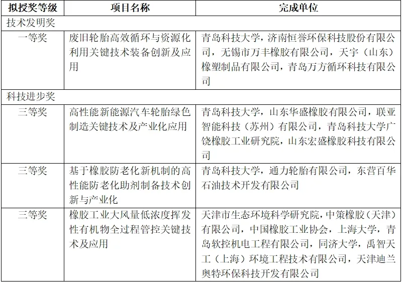从本次公示的拟授奖名单来看,经石化联合会组织有关专家评审,来自橡胶轮胎行业的4项科技成果,分别拟授一等奖、三等奖。