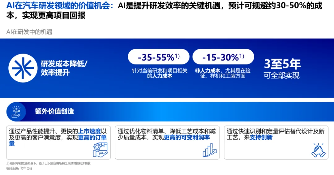 在具体效益上,针对研发环节全流程的AI用例场景识别,以及相关用例带来的价值潜力,基于罗兰贝格的测算,未来3-5年间,随着AI用例的全面落地,AI可帮助整体研发环节降低35%-55%的人力成本、15%-30%的非人力成本(含验证、样机等)。