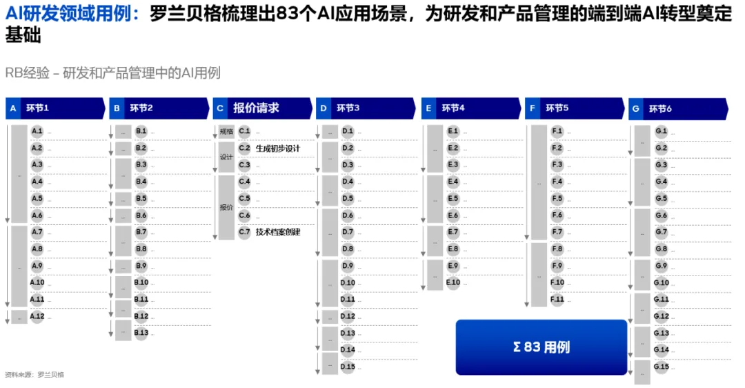 罗兰贝格梳理出83个汽车研发AI应用场景,覆盖创新设计、核心工程、研发管理等全流程,而不同类型企业的应用重心有所差异。