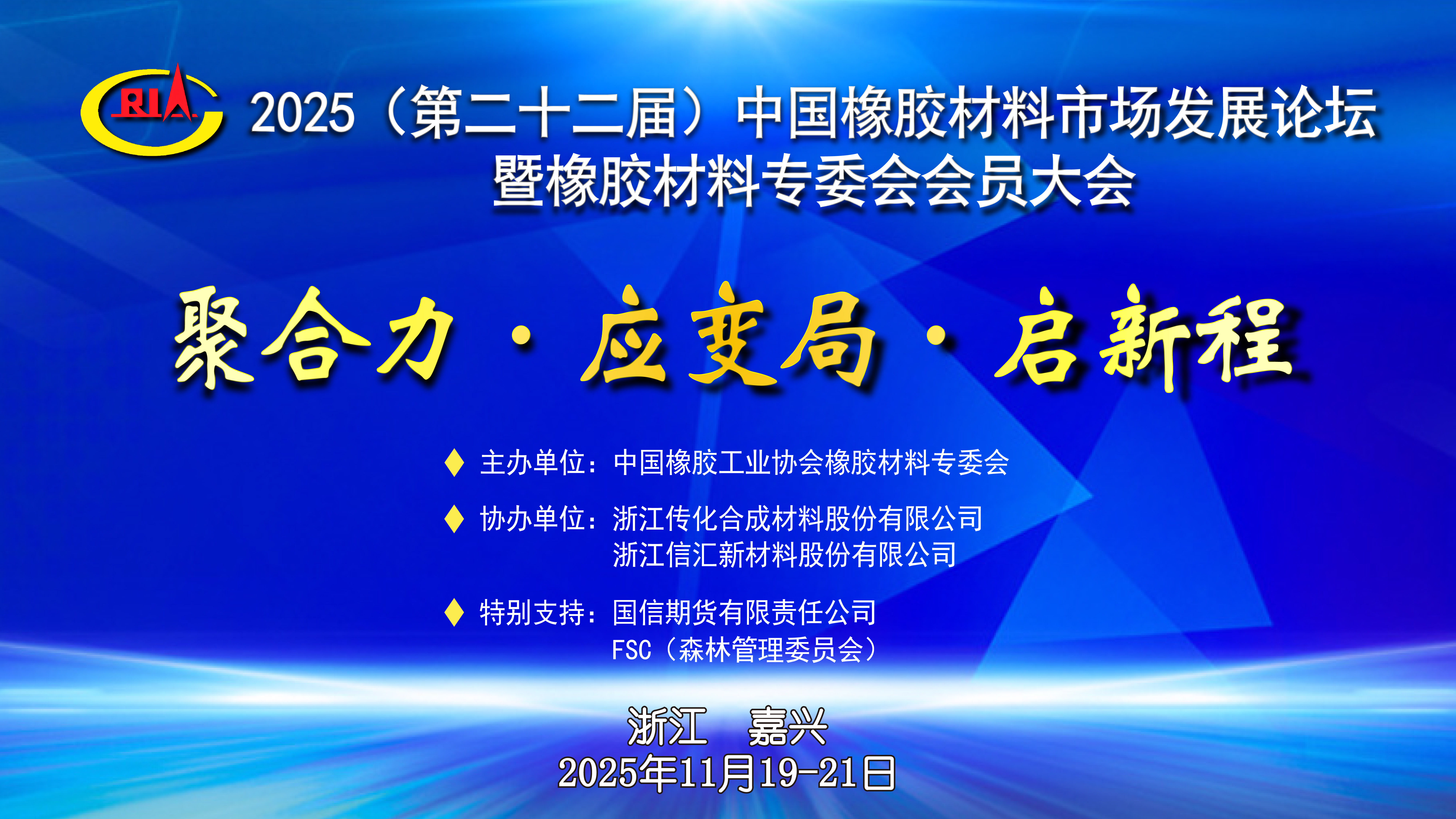 中国橡胶工业协会橡胶材料专业委员会定于2025年11月19-21日在浙江嘉兴举办“2025(第二十二届)中国橡胶材料市场发展论坛暨橡胶材料专委会会员大会”,会议主题:聚合力、应变局、启新程。